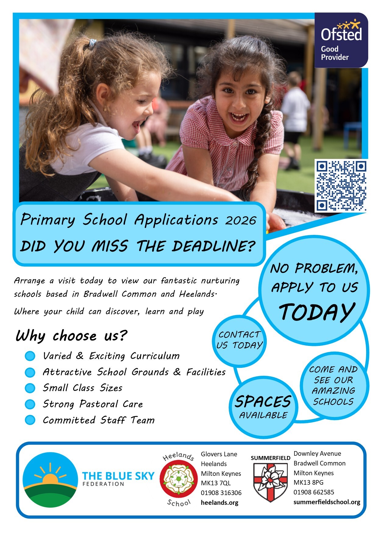 We are a two-form entry primary school situated in Bradwell Common near the centre of Milton Keynes and we are a part of The Blue Sky Federation, alongside Summerfield School.