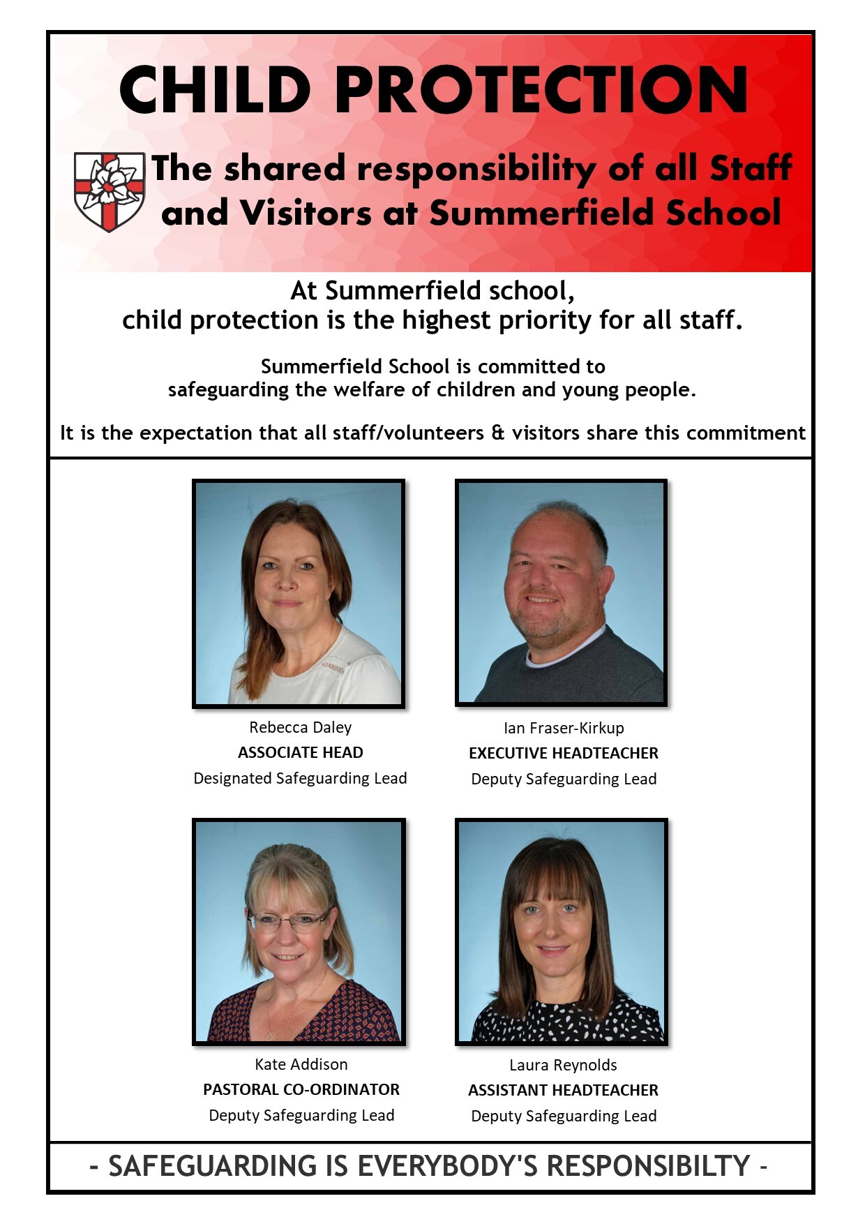 Summerfield School is committed to safeguarding the welfare of children and young people. It is the expectation that all staff and volunteers share this commitment.