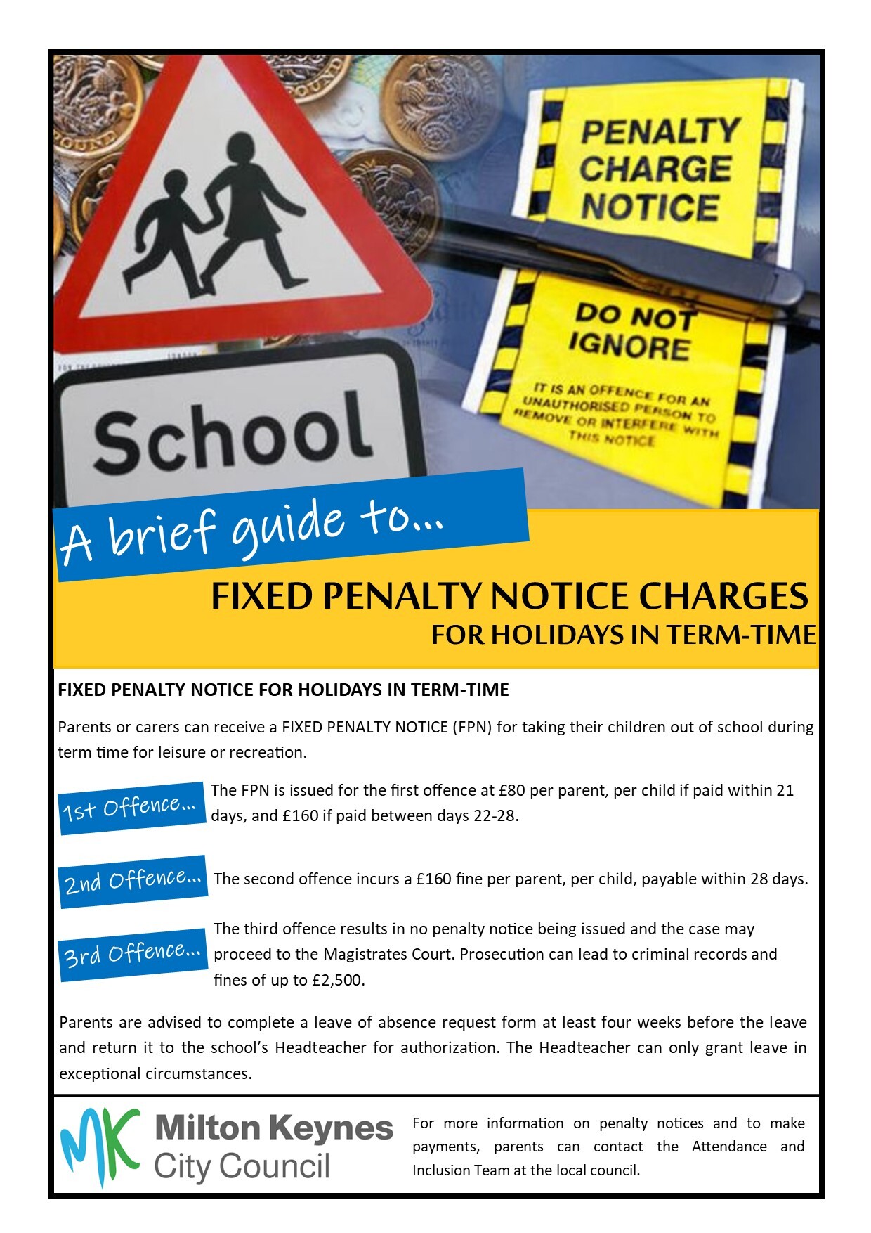 Fixed Penalty Notices (FPN) are issued to each parent and per child. A FPN is £80 if paid within 21 days, and £160 if paid between 22 and 28 days. If the fine is not paid, you will be prosecuted in the magistrates’ court and could receive a fine of up to £1000 (per parent) and a criminal record.